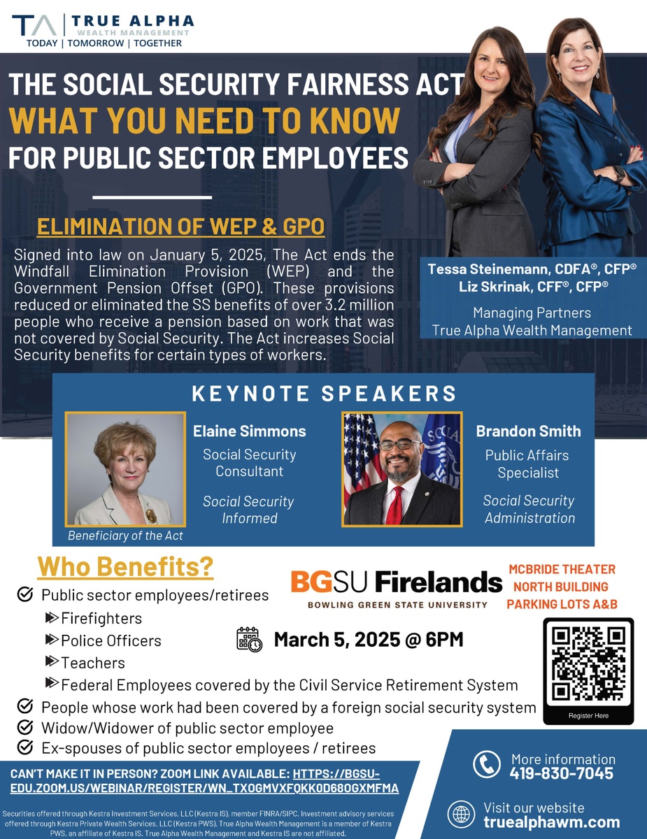 Please join Certified Financial PlannerTM professionals Tessa Steinemann and Elizabeth Skrinak for this important presentation regarding updates and information related to the Social Security Fairness Act. Our guest speakers are Elaine Simmons with Social Security Informed and Brandon Smith from the Social Security Administration. They will be presenting the latest information regarding additional benefits, payout of retroactive benefits, identifying beneficiaries that may need to make an initial application and any recent legislative updates. There will be a Q & A session following the presentation.